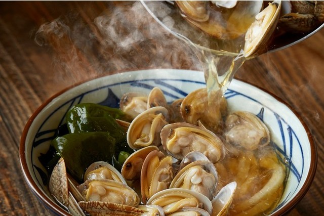 『あさりうどん』は、丸亀製麺の春だけの人気商品です。注文ごとに一杯ずつ、たっぷりの殻付きのあさりを丸亀製麺自慢のだしとあわせることで、香り豊かな一杯に仕上げられます。あつあつでもちもちの麺は、水で締めずに釜から直接、丼に盛り付けているので、まだまだ肌寒い夜に、お腹の底からぽかぽかと温まる一杯です。