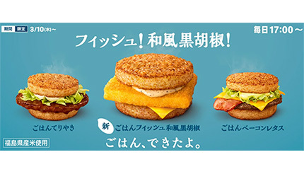 日本マクドナルドは本日(3月10日)から、ごはんバンズを採用した新製品「ごはんフィッシュ 和風黒胡椒」を販売する。夜マックのメニューとして、「ごはんてりやき」と「ごはんベーコンレタス」を同時に期間限定で提供する。