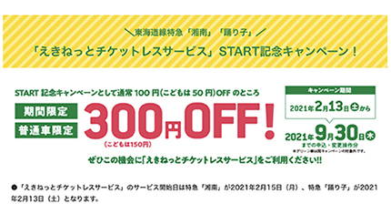 「えきねっとチケットレスサービス」START記念キャンペーンとして東海道線特急は2021年9月30日まで、また常磐線全線運転再開1周年記念「えきねっとチケットレスサービス」キャンペーンとして常磐線特急は21年5月5日の申込・変更操作分まで、それぞれ割引対象となる。