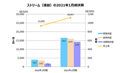 ネット通販「ecカレント」などを展開するストリームはこのほど、2021年1月期の連結決算を発表した。新型コロナによる巣ごもりやリモートワークの需要増大によって、売上高が280億7600万円(前期比19.9%増)と増収、営業利益が6億6100万円(同308.0%増)、経常利益が6億3900万円(同345.2%増)、親会社株主に帰属する当期純利益が5億7000万円(同703.4%増)と大幅な増益となった。