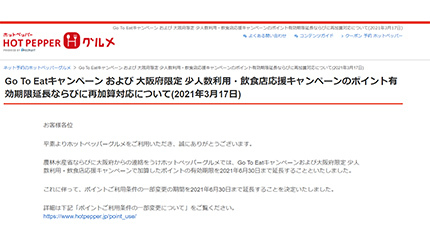 ホットペッパーグルメの「ポイントが使える店」のみで利用できるGo To Eat キャンペーンポイントの本来の有効期限は、2020年10月加算分が12月末日、11月加算分が21年1月末日だったが、いったんともに21年3月31日に延長した。しかし、1都3県で再び緊急事態宣言が出され、ポイントを利用した店内飲食の自粛と、テイクアウトでもポイントが使える店での利用を呼びかけていたが、事前の「延長なし」の告知から一転、再延長を決定した。
