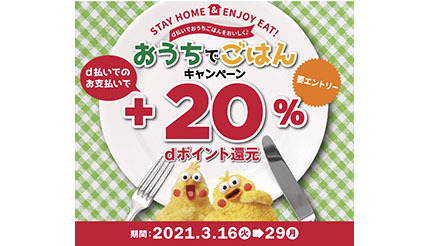 NTTドコモは、「d払い」で支払いが可能なオンラインショップを対象に「おうちでごはんキャンペーン +20%dポイント還元!」を3月16日から3月29日23時59分まで実施している。