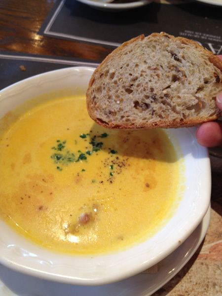 ―止まりませんね。美味しそうなカボチャスープがきました。これはあれですか、パンをスープに浸けて食べてもいいんでしょう?