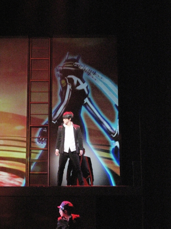 そんな主人公がペルソナを召還するところは、スクリーンを使って演出。「イザナギ!」と叫ぶと、ペルソナがスクリーン上に現われて電撃を出し、それをくらったシャドウ(こちらは生身の人間が演じています)が次々と倒れていきます。3次元と2次元を融合させたこのバトルこそ、「VISUALIVE」の目玉だと言っていいでしょう。