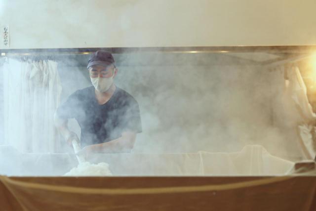金属製ではなく、昔ながらの木製の甑(こしき)にこだわり米を蒸し上げる。撮影/鈴木規仁