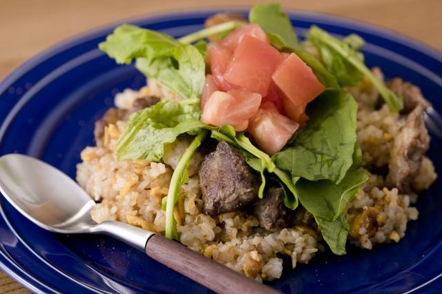 スーパーなどでは手に入りにくいラム肉を、サイゼリヤでテイクアウトして手軽に作ることができます。いつものチャーハンに混ぜて、食べごたえのある一皿に。