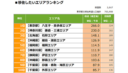 都民で移住したいエリアの1位は「【東京都】八王子・奥多摩エリア」 、2位は「【神奈川県】鎌倉・三浦エリア」 となった。3位は「【北海道】石狩エリア」、4位は「【沖縄県】離島・諸島エリア」 、5位「【福岡県】福岡エリア」と北海道と九州地方が続いた。