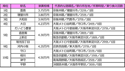 リクルート住まいカンパニーが運営するニュースサイト「SUUMOジャーナル(スーモジャーナル)」は、「梅田駅まで30分以内、家賃相場が安い駅ランキング 2021年版」の結果を発表した。
