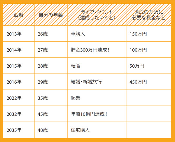 「西暦」「自分の年齢」「ライフイベント」「達成のために必要な要素」を記入したライフプラン表を作成することで、将来達成するべき目標が具体的に想像できる。もちろん、最初は漠然とした目標や予定を書いてOK。定期的に見直すことで、今やるべきことや、新たな目標を発見しやすくなる。また、結婚や出産など、家族が増えたときには、自分の年齢だけでなく家族の年齢も書き加えることで、ライフイベントや必要な出費をより想定しやすくなる。