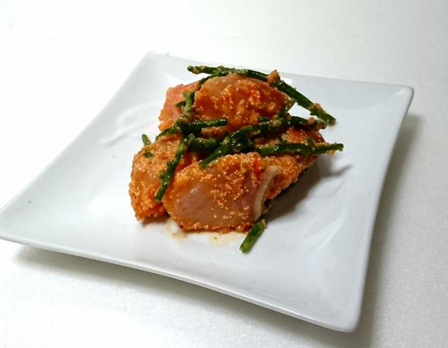 ひと口サイズにカットされたブリと、シャキッとした食感のシーアスパラガスを明太子ソースで和えた、ピリッと辛いメニューです。ニンニクの風味も感じられるパンチのある味わいが食欲をそそります。