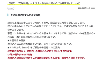 3月28日17時更新の告知によると、28日はMNP(他社からの乗り換え)は受付せず、SIMカード配達日の目安は初日の26日の申し込み分が28日~4月6日、27日が4月6日~12日、28日が4月13日以降となっていた。