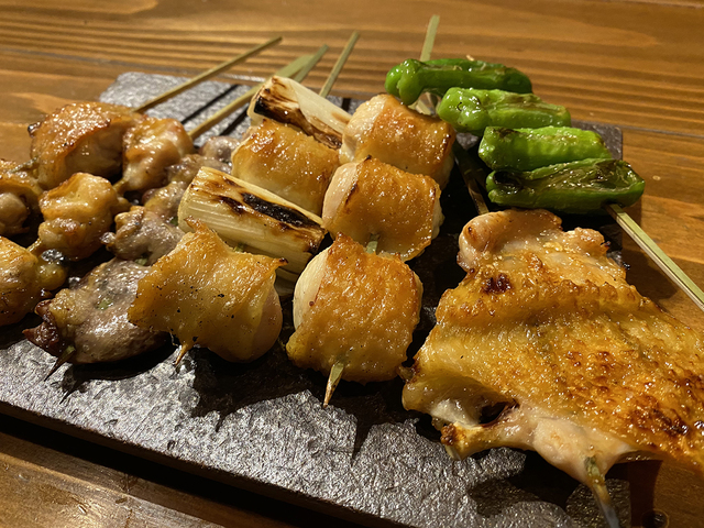 比内亭のメニュー「おまかせ7種」は、持った時にずっしりと来る豪華さ!焼き鳥が6本と野菜が1本、日によって少し内容が変わります。