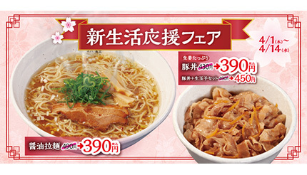 今回の新生活応援フェアでは、「醤油拉麺」(通常490円)を390円、「豚丼」(通常430円)を390円、「豚丼+生玉子セット」(通常490円)を450円、「豚丼ミニ」(通常290円)を270円、「醤油拉麺・ミニ豚丼」を660円、「豚丼・ミニ拉麺」を610円で提供する。