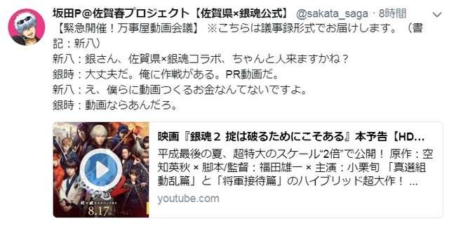 銀魂の主人公・万事屋の坂田銀時(銀さん)が「坂田P」として、初めて自治体をプロデュース! アニメ「銀魂」と佐賀県のコラボ企画「佐賀春プロジェクト」。Twitter上で驚きのPR作戦が展開されています。