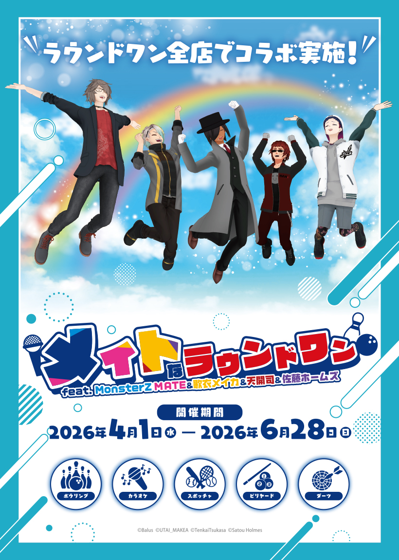 • 新商品人気VTuber×ラウンドワンのコラボ『メイトなラウンドワンfeat.MonsterZ MATE&歌衣メイカ&天開司&佐藤ホームズ』好評開催中!5名がボウリングに挑戦する動画公開や新グッズ追加販売!