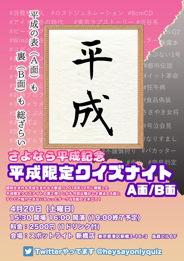 < > 前の写真 記事に戻る 次の写真 X Facebook この記事の写真一覧(全12枚) あわせて読みたい 体験できる“チョベリバ"って何の略? 「平成限定クイズナイト」がおもしろそう! 意味不明(いい意味で)“ウソの思い出”を語り合う「架空同窓会」が密かに話題!? 予想外平和な水族館に「危険ないきもの」が大集合! しながわ水族館の人気企画 おでかけ「バービー」60周年! 国内唯一のコラボイベントがスカイツリーで開催 新商品「三幸学園」がJWL2025のオフィシャルパートナーとして協賛決定 新商品株式会社大谷デザイン研究所は「Sannomiya City Xmas 2025」にて、神戸阪急壁面 大型プロジェクションマッピングを制作いたしました。 >平成限定クイズナイトA面/B面クイズイベント平成