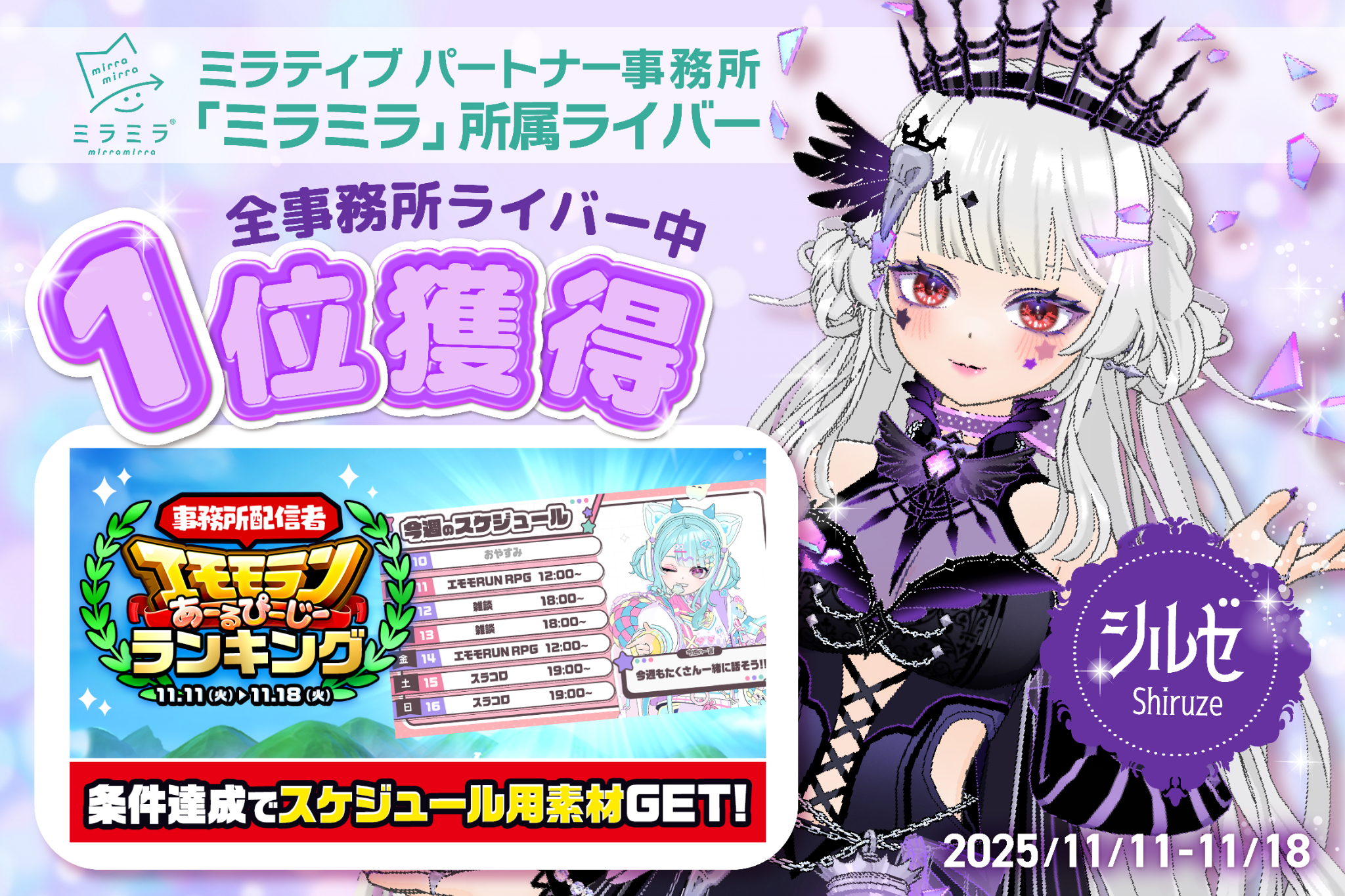 新商品ミラティブパートナー事務所「ミラミラ」所属ライバー「シルゼ」が「事務所配信者エモモランあーるぴーじーランキング」にて全事務所ライバー中1位を獲得