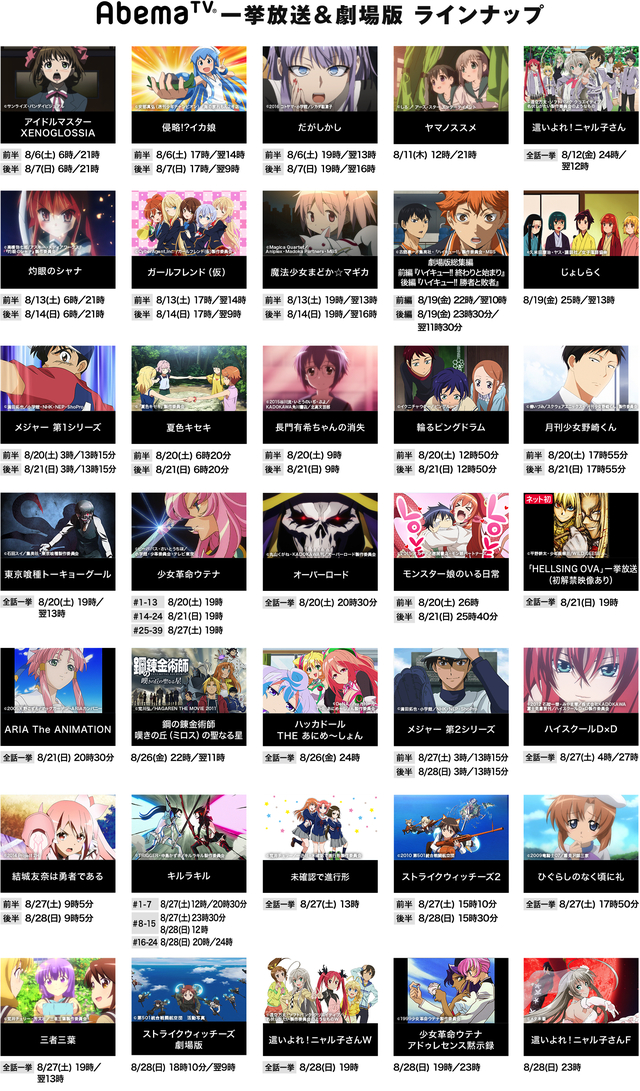「AbemaTV」8月のアニメ一挙放送ラインナップ発表!アイマスゼノグラシア、みでし、ヘルシングなど過去最多本数