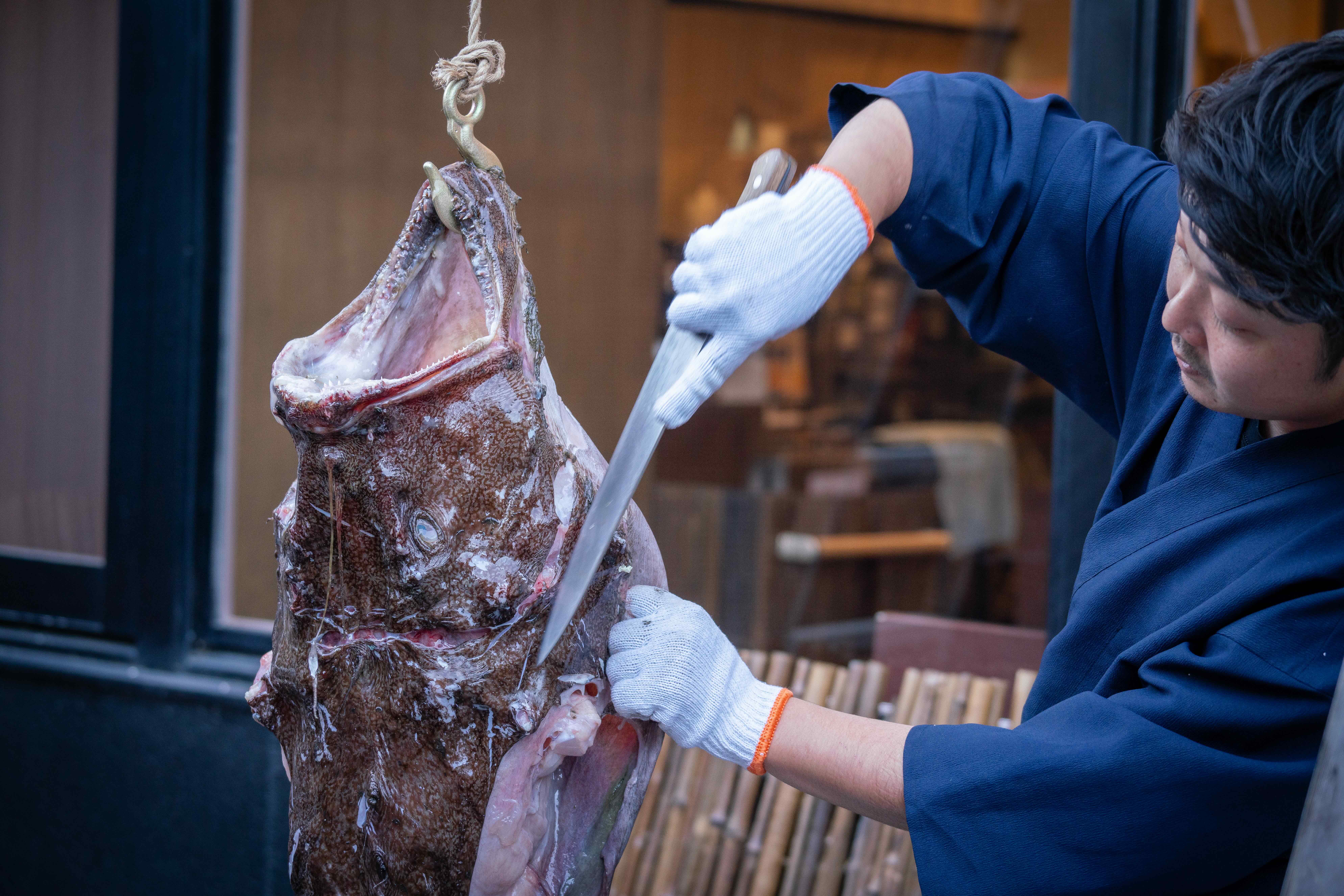 新商品おふろcafe 白寿の湯にて、年始に冬の風物詩「アンコウのつるし切り」を実演。海なし県で行う海の食育イベントです