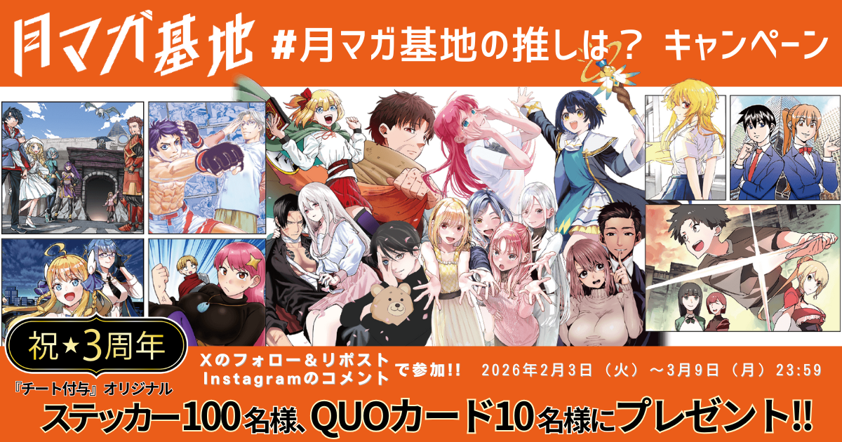 新商品月刊少年マガジン編集部がおくるWebコミック配信サイト『月マガ基地』が3周年! 無料話大公開と、『チート付与』ステッカーや基地QUOカードの当たる記念キャンペーンを開催!! -