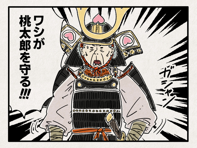 >子育てマンガおじいさんとおばあさんと、時々、ももたろうおでかけももまち外出子ども_0歳子ども_1歳