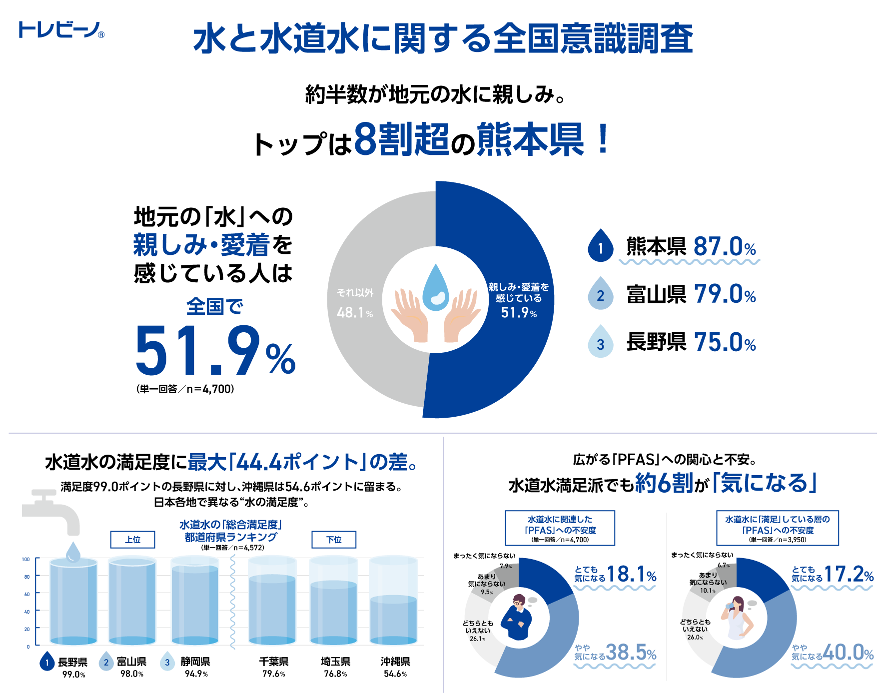 【トレビーノ(R)|水と水道水に関する全国意識調査】「水の親しみ」1位は熊本県、「水道水総合満足度」1位は長野県