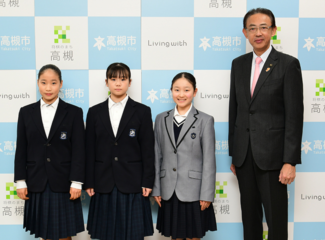 高槻市立中学校に在籍する3人がスケートの全国大会出場を市長に報告