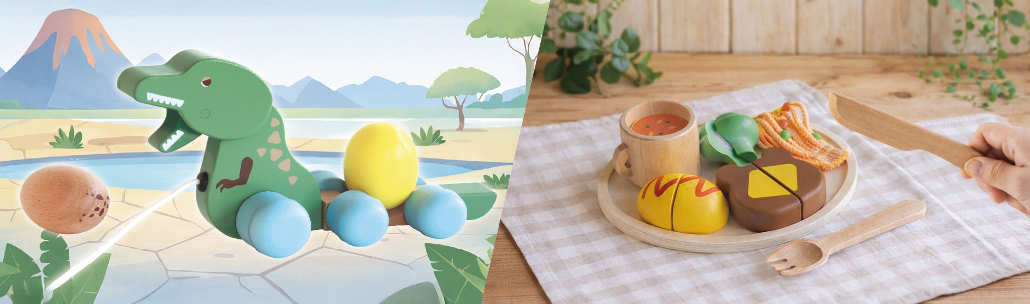 【新商品】GENIから木製知育玩具2種が同時発売。好奇心をくすぐる恐竜プルトーイと、レストランごっこが楽しめるままごとセットが登場