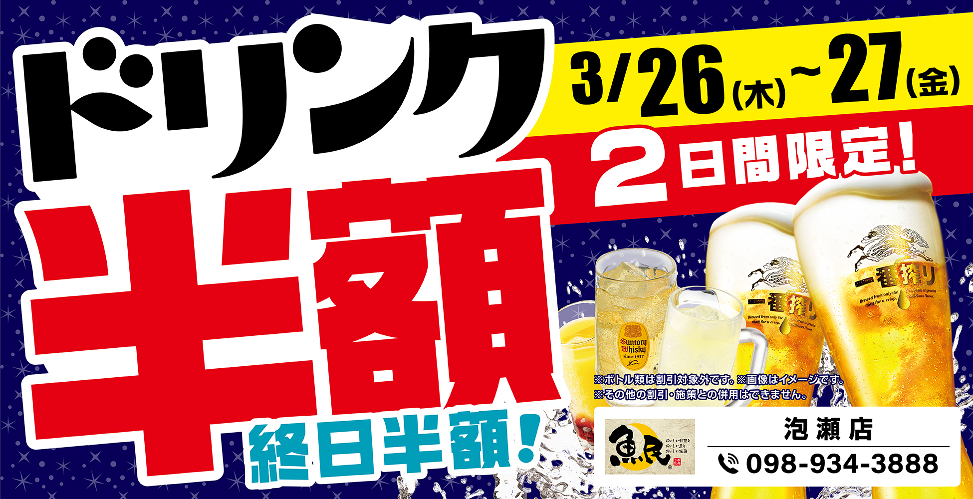 沖縄県の「魚民 泡瀬店」のグランドメニューが新しくなります!グランドメニューリニューアルを記念して、2日間限定の“ドリンク半額セール”を開催します! -