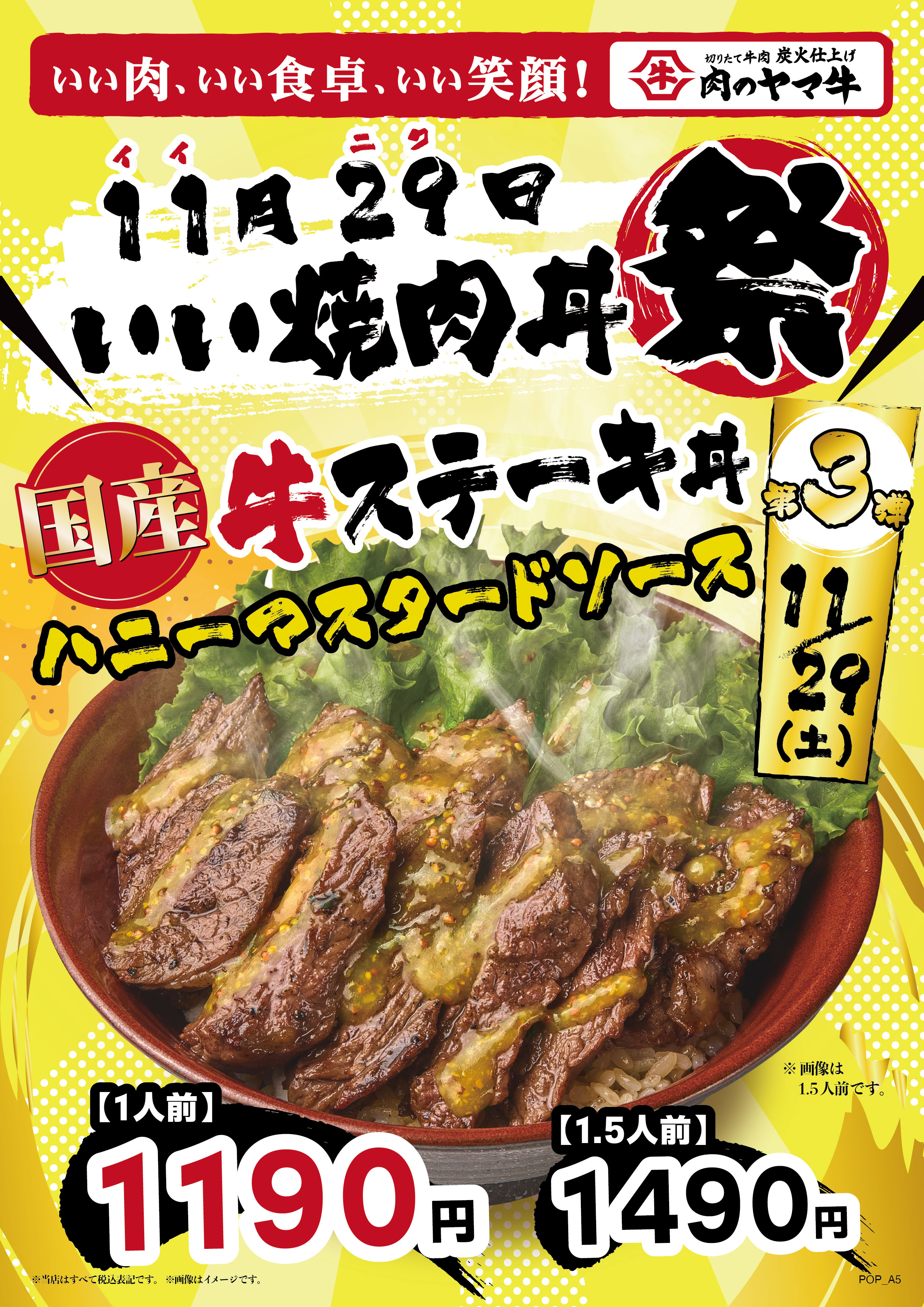 11月の“いい焼肉丼祭り”第3弾!ラストを飾るのは!大人気の『国産牛ステーキ丼』!爽やかな酸味とコク×スパイシーガーリック!肉のヤマ牛が提案する” クセになるごちそうな一杯“ -