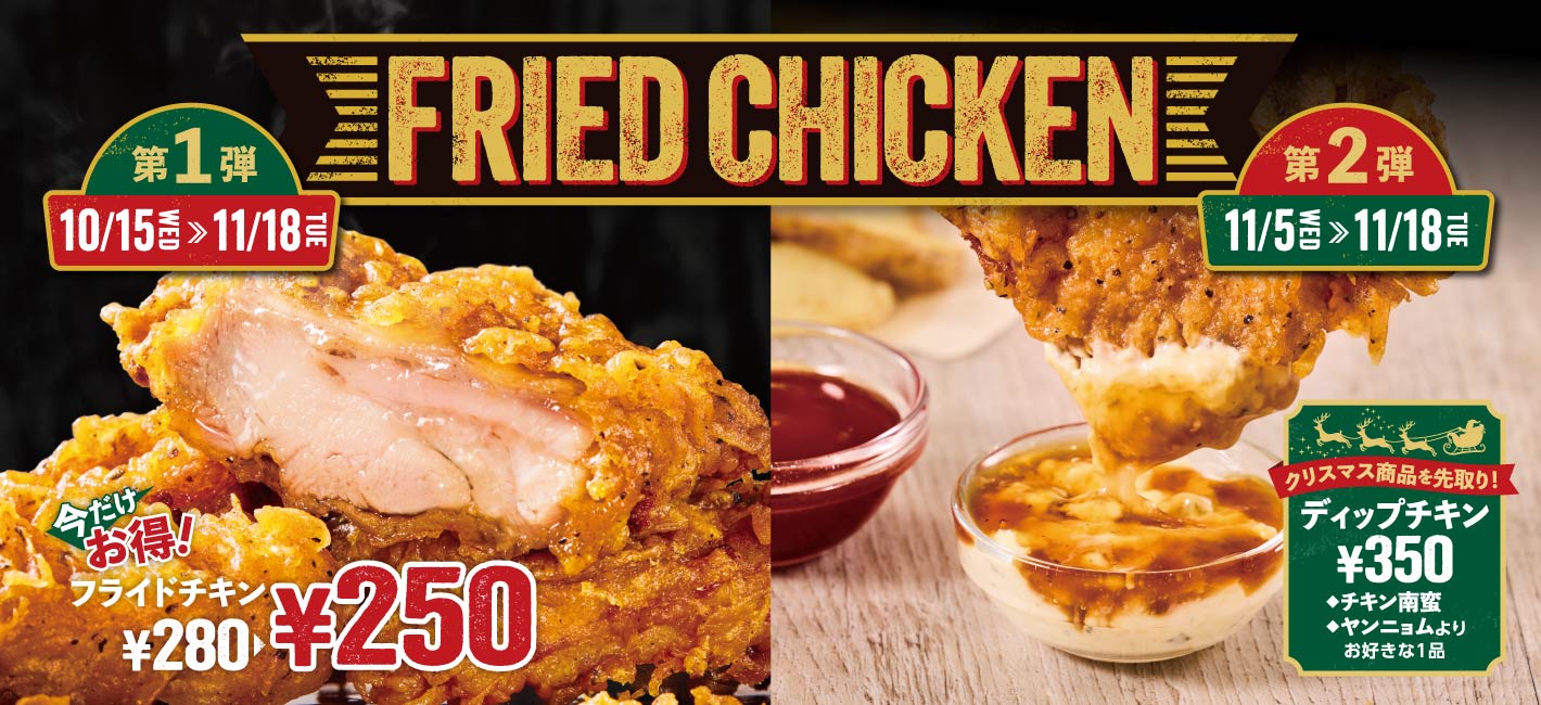 クリスマス気分の先取りをお得に!店内調理の肉厚ジューシーチキンが30円引き。チキン南蛮・ヤンニョムの“味変ディップ”も新登場! -
