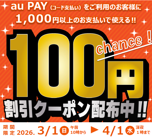 【利用回数無制限!】au PAY 100円OFFクーポンが、2026年3月1日(日)から3ブランド4店舗にて一斉実施!