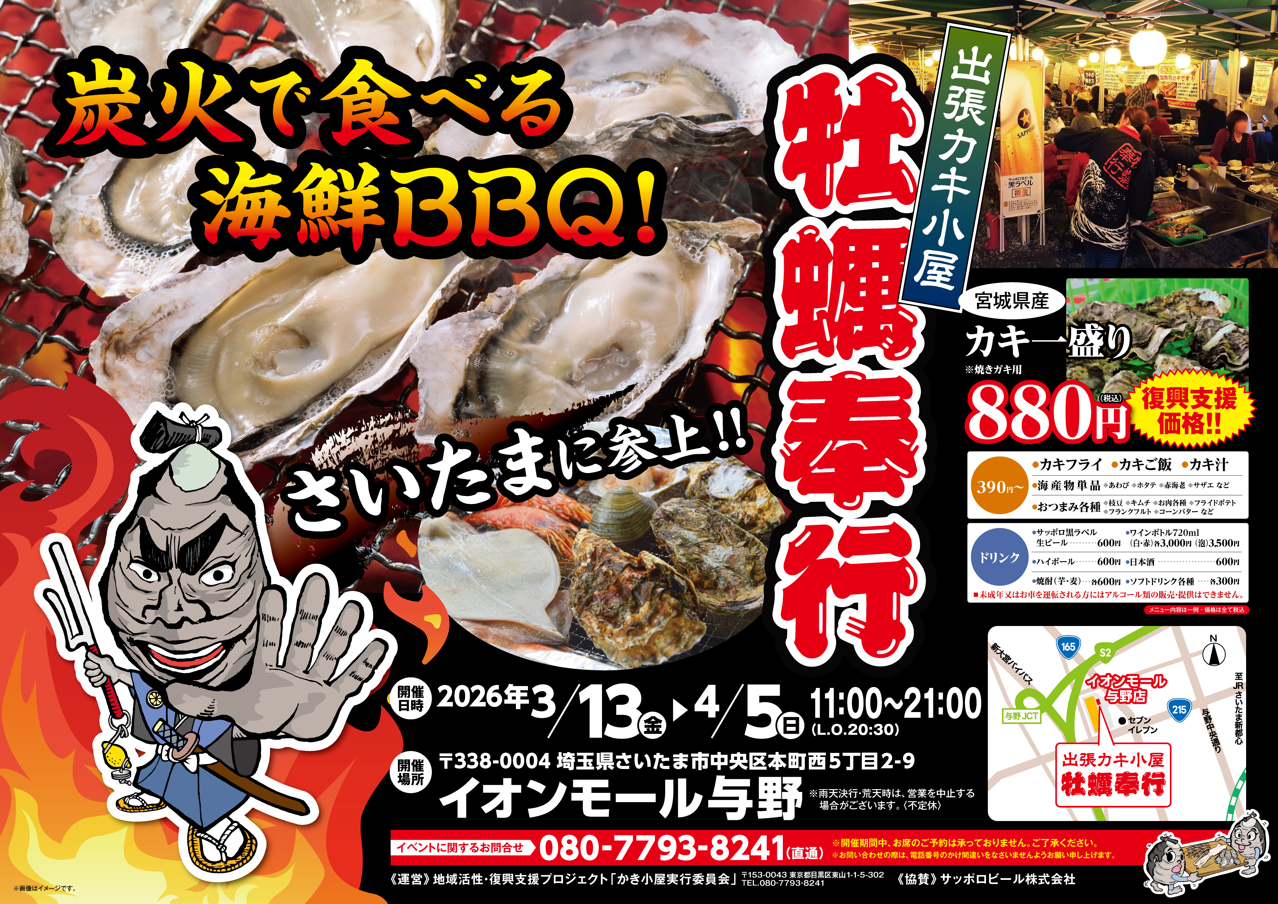 埼玉県イオンモール与野に「出張カキ小屋」参上! 3月13日~期間限定開催!《 宮城県産殻付き牡蠣が一盛り880円!! 》