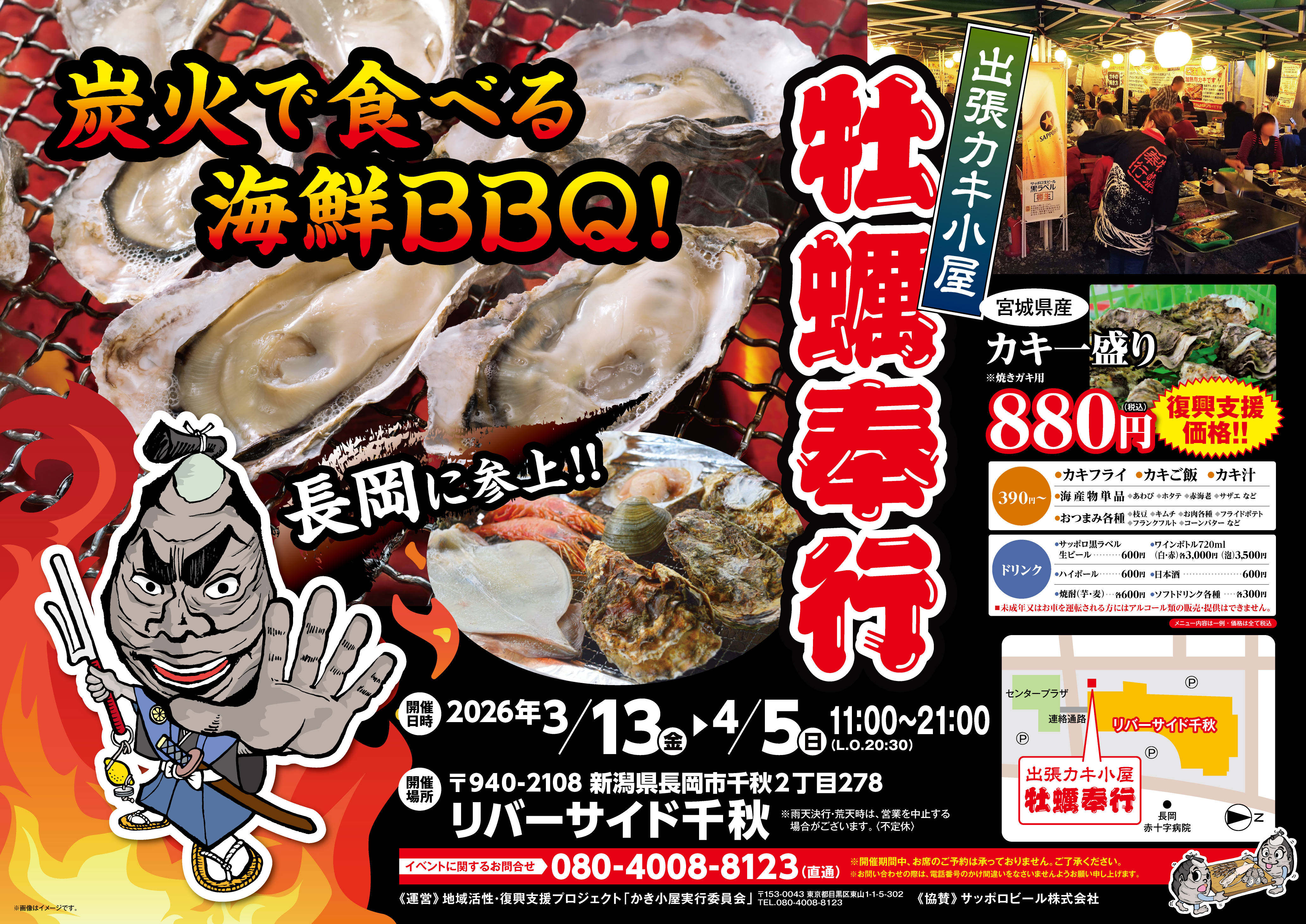 新潟県リバーサイド千秋に「出張カキ小屋」参上! 3月13日~期間限定開催!《 宮城県産殻付き牡蠣が一盛り880円!! 》