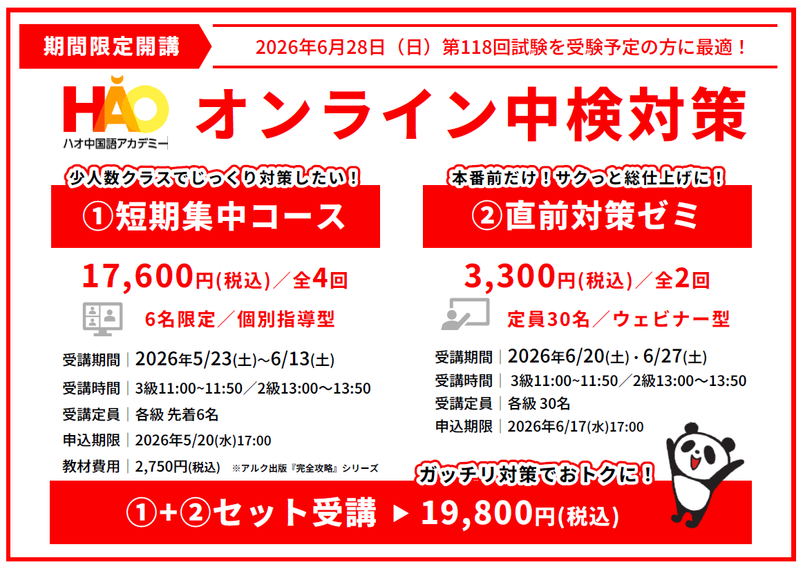 株式会社イーオン、ハオ中国語アカデミーにて2026年6月実施の中国語検定2級・3級対策として「短期集中コース」「直前対策ゼミ」をオンラインで開講 -