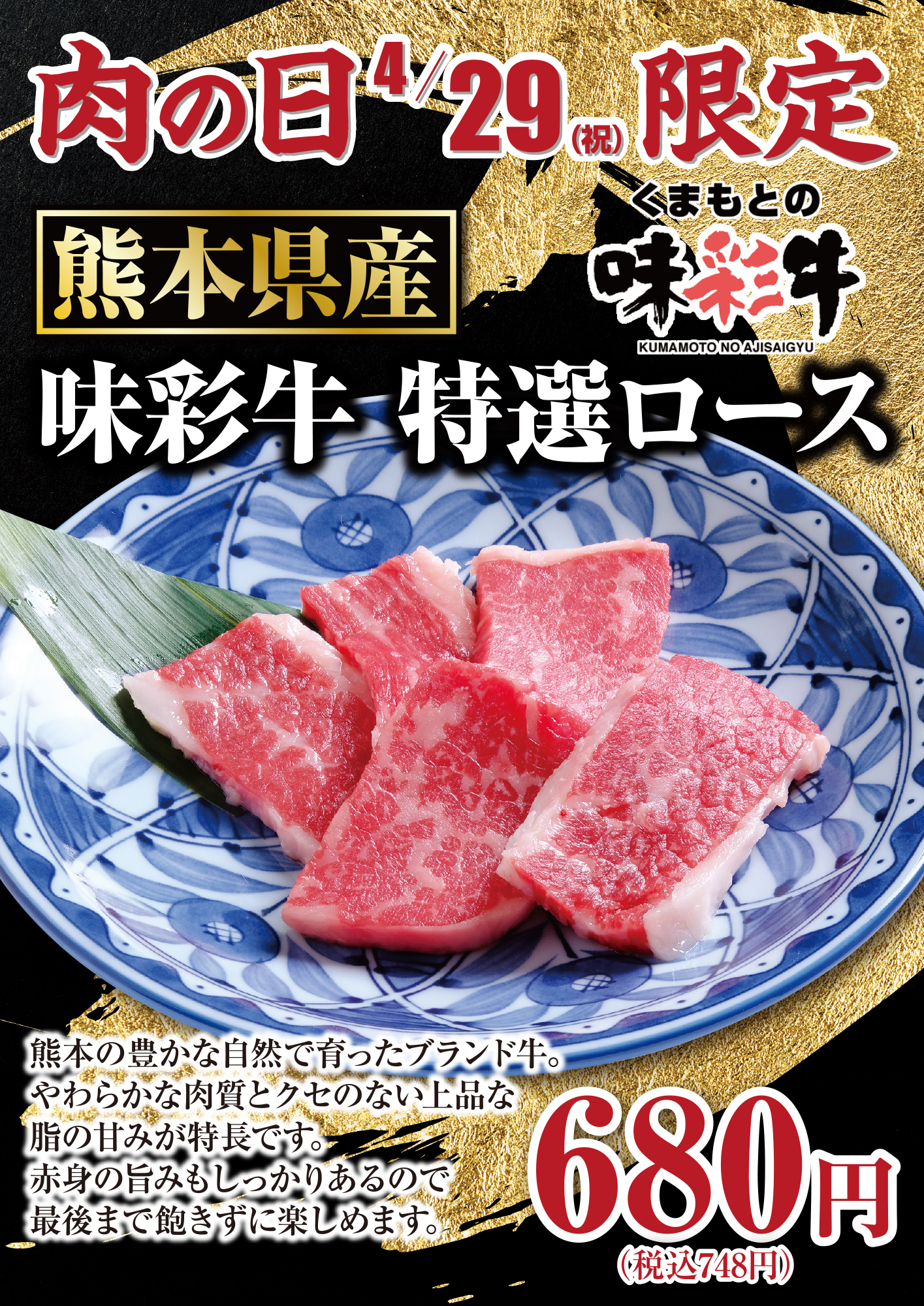 【あみやき亭中部】4月29日“肉の日”限定!熊本県産ブランド牛「味彩牛 特選ロース」を特別価格でご提供!~やわらかさ、脂の甘み、赤身の旨み。すべてを一皿で味わう贅沢焼肉~ -