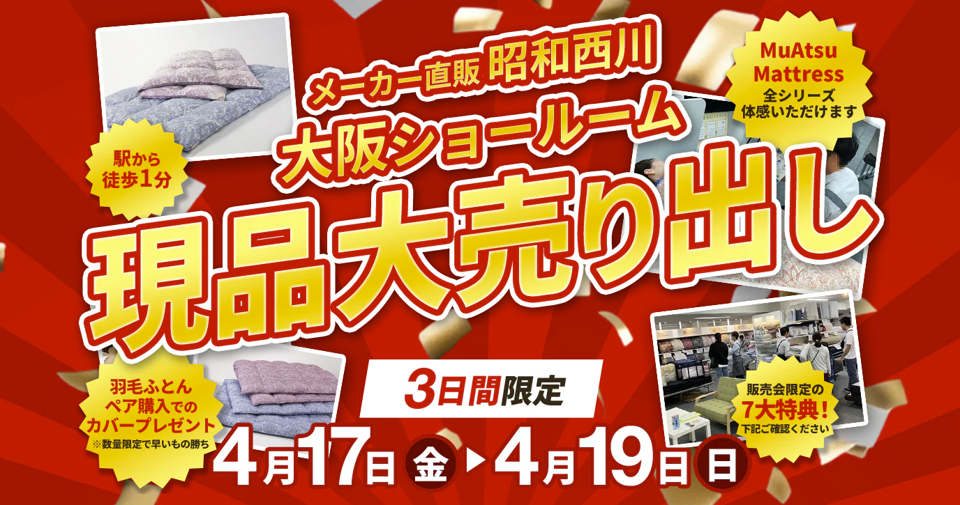 羽毛ふとんが今だからお得!【4月17日(金)~19日(日)】昭和西川・大阪ショールームで3日間限定セール -