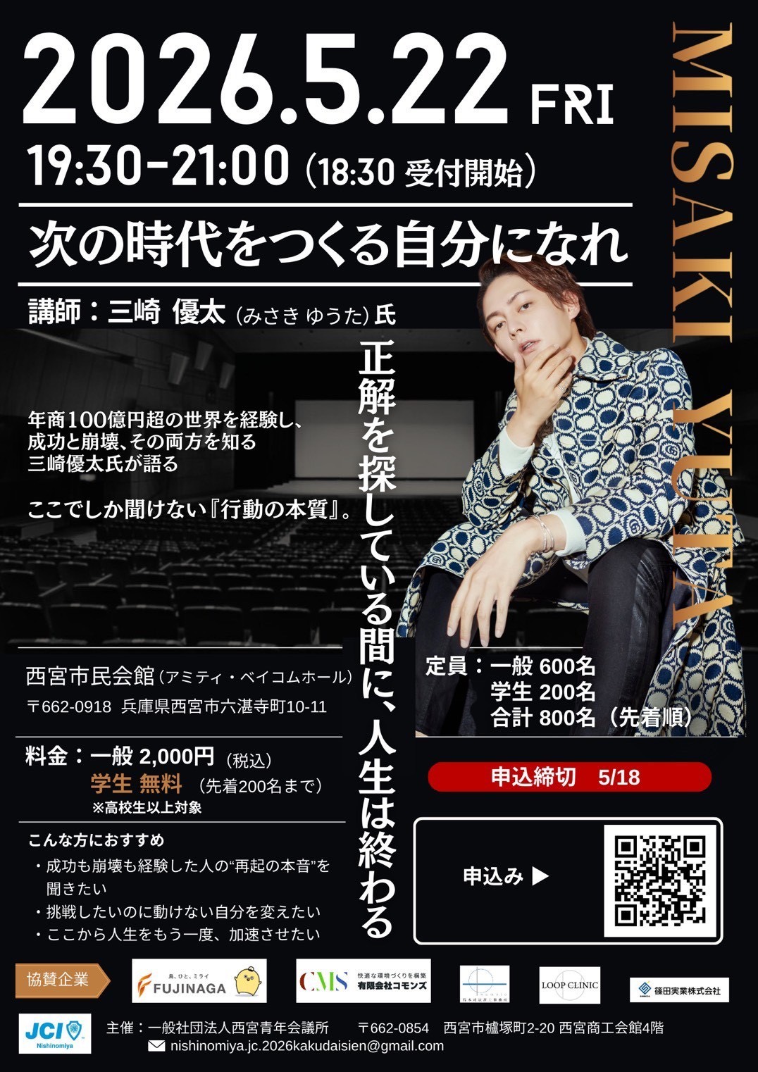 【西宮青年会議所】元「青汁王子」三崎優太氏が登壇!『次の時代をつくる自分になれ~正解を探している間に、人生は終わる~』―栄光・転落・再起を語る、魂の 90 分講演 -