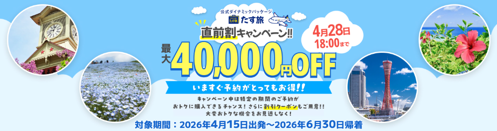 4月~6月限定【直前割キャンペーン!!】で最大40,000円OFFクーポンが利用可能!《スカイマーク公式》ダイナミックパッケージ(航空券+ホテル)『たす旅』に直前予約もお任せ! -