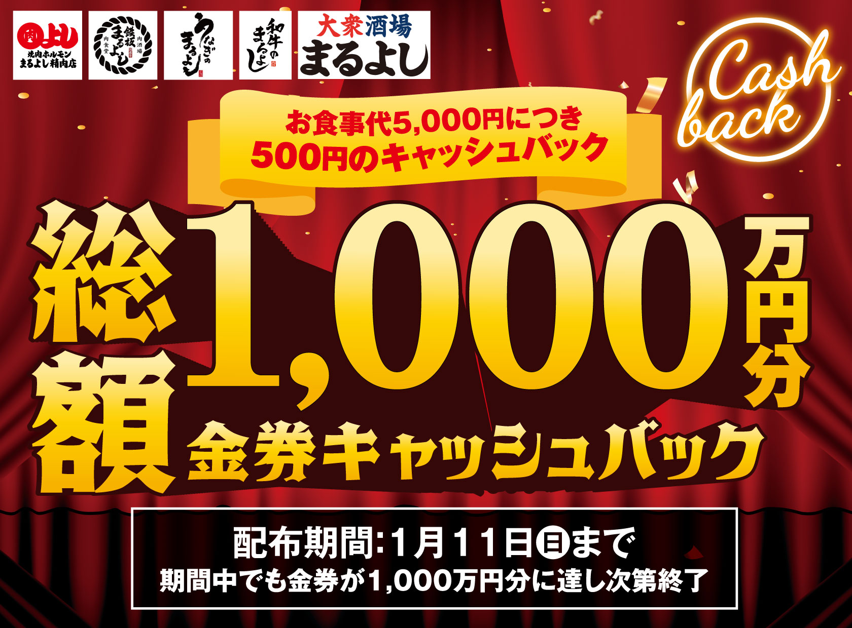 【総額1,000万円!】年末年始の金券キャッシュバックキャンペーン!|まるよしグループ全16店舗で期間限定開催!|2025年12月12日(金)~2026年1月11日(日)