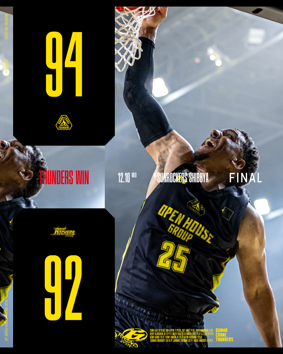 【群馬クレインサンダーズ:試合結果】12/11(水) vs サンロッカーズ渋谷 りそなグループ B.LEAGUE 2025-26シーズン