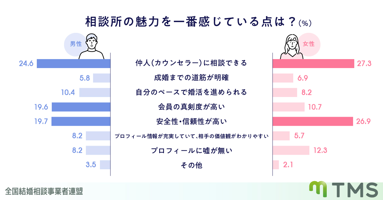 【会員に聞いた】結婚相談所の魅力は?男女ともに「仲人に相談できることが魅力」が最多回答。次いで安全性・信頼性の高さ -