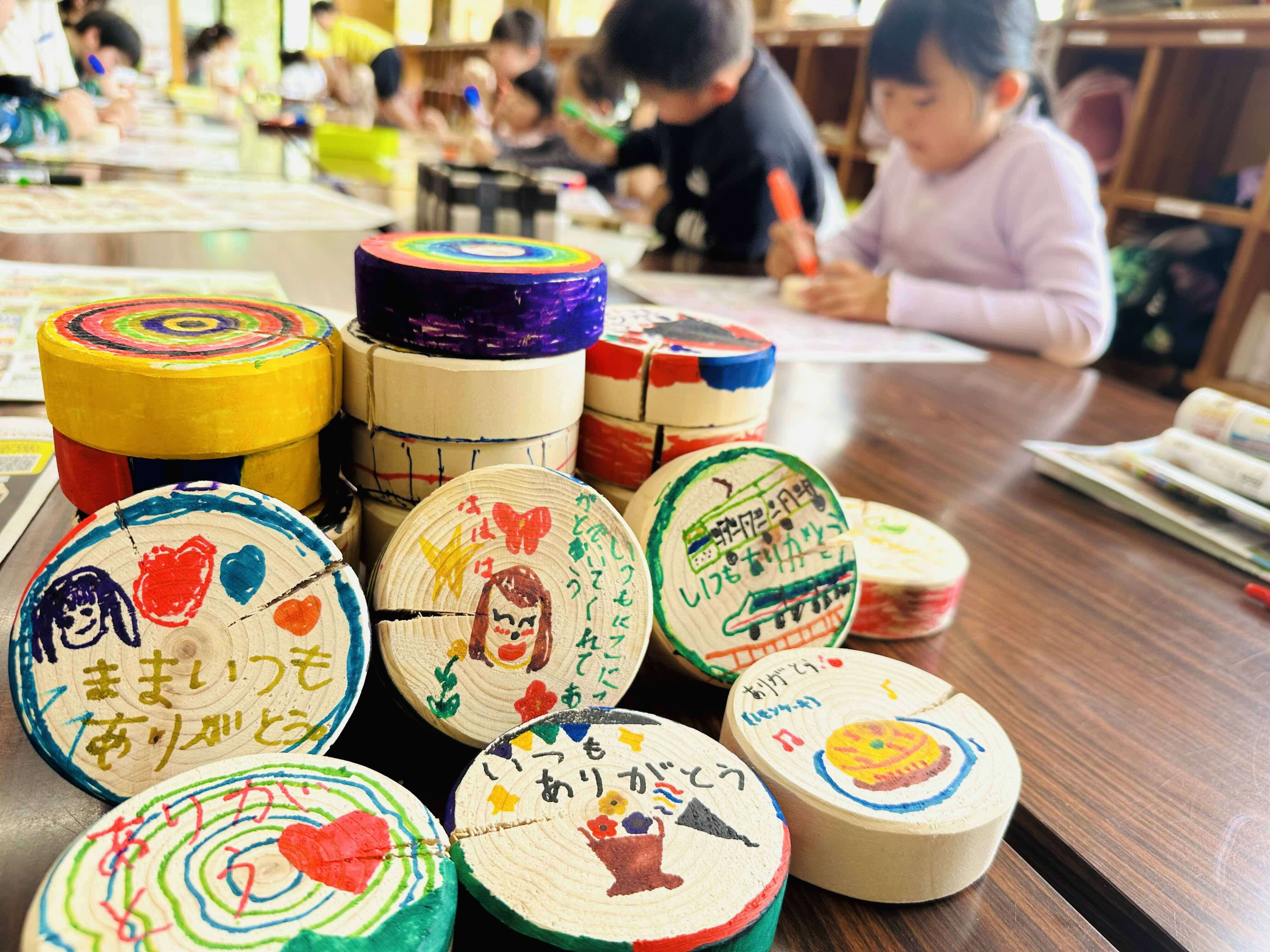昭和レトロな温泉銭湯 玉川温泉が「母の日イベント」に向けて、学童保育の子供たちを訪問。地元間伐材のヒノキ入浴木にメッセージをもらいます -
