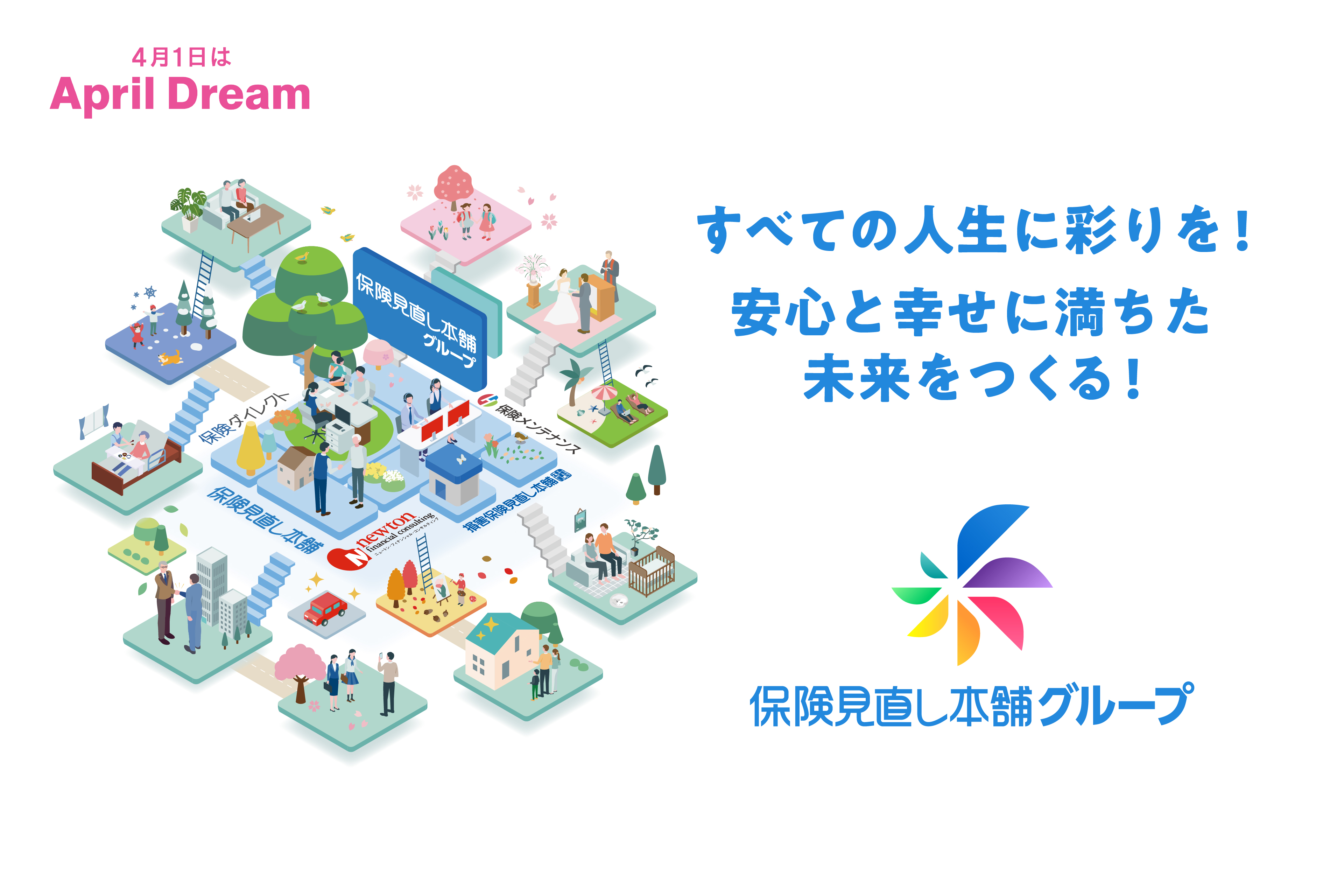 <April Dreamプロジェクト>保険見直し本舗グループは、 誰しもが自由に人生を彩り、安心と幸せに満ちた未来の実現を目指します。 -
