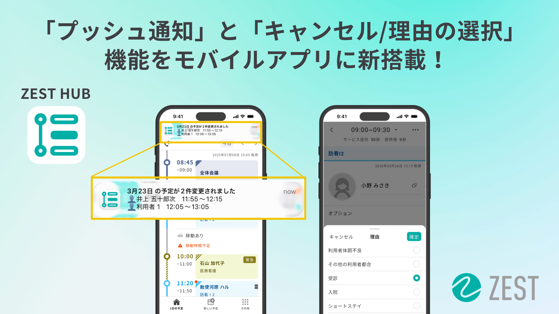 在宅医療・介護の収益改善プラットフォーム「ZEST」、モバイルアプリに「プッシュ通知」と「キャンセル/理由の選択」機能を新搭載。 -