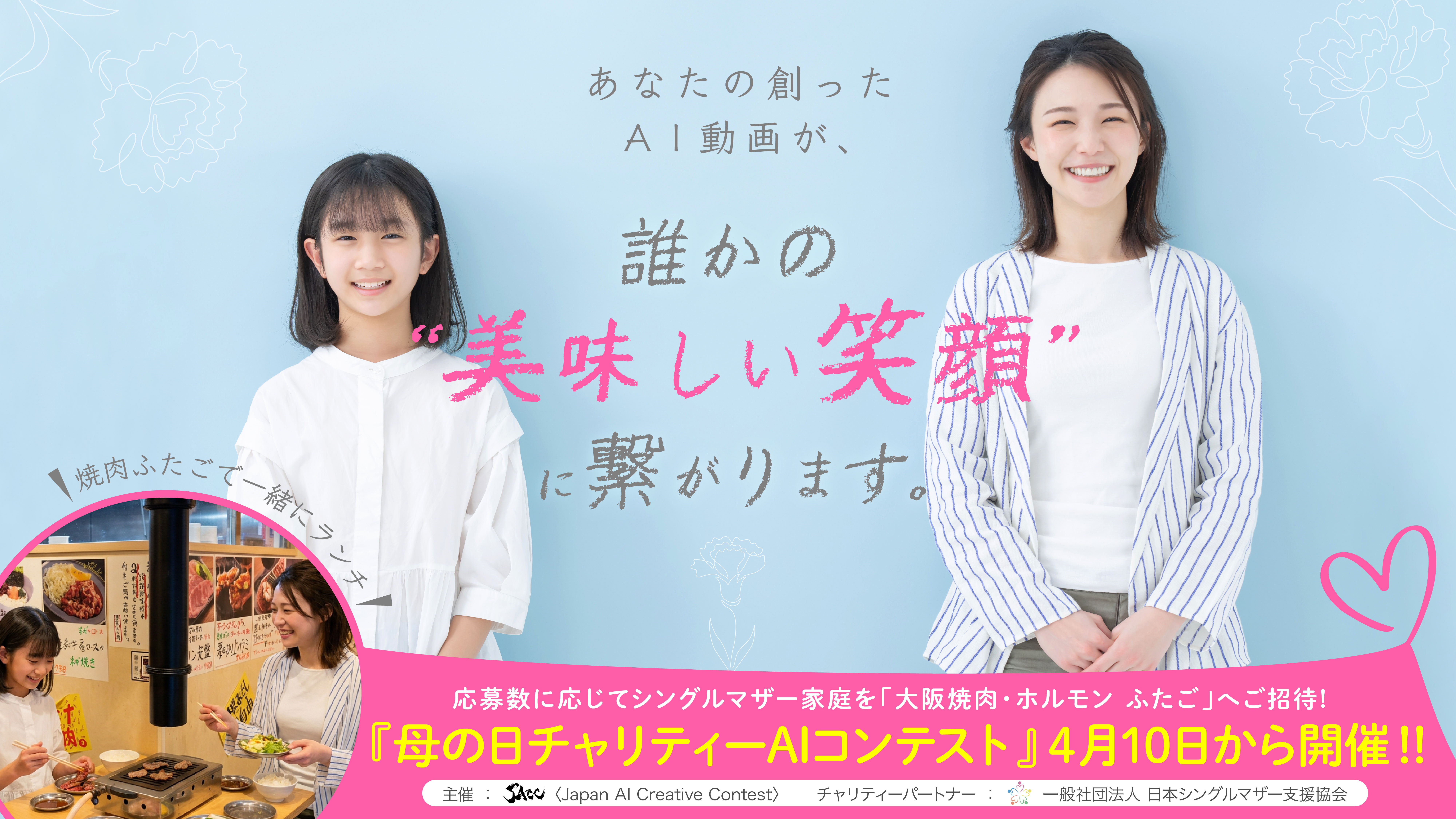 【AI動画が「家族の笑顔」に変わる】「JACC」、応募数に応じてシングルマザー家庭を「大阪焼肉・ホルモン ふたご」へ招待する『母の日チャリティーAIコンテスト』を4月10日より開催! -