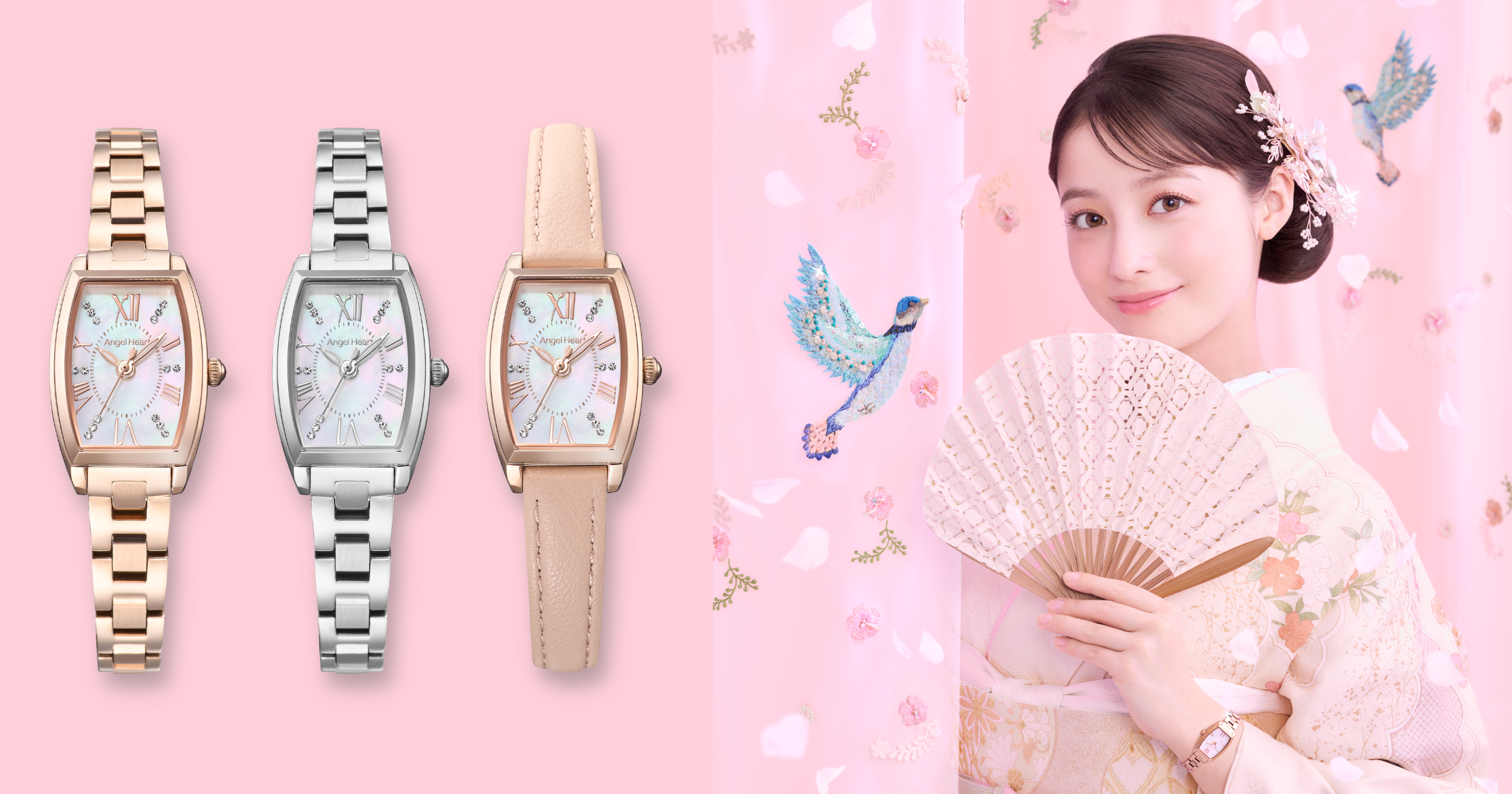 橋本環奈さんがミューズを務める時計ブランドAngel Heartは、小ぶりなトノー型のMADE IN JAPANモデル『SAKURA TIME』3型を全国の時計店と公式オンラインショップで発売します。 -