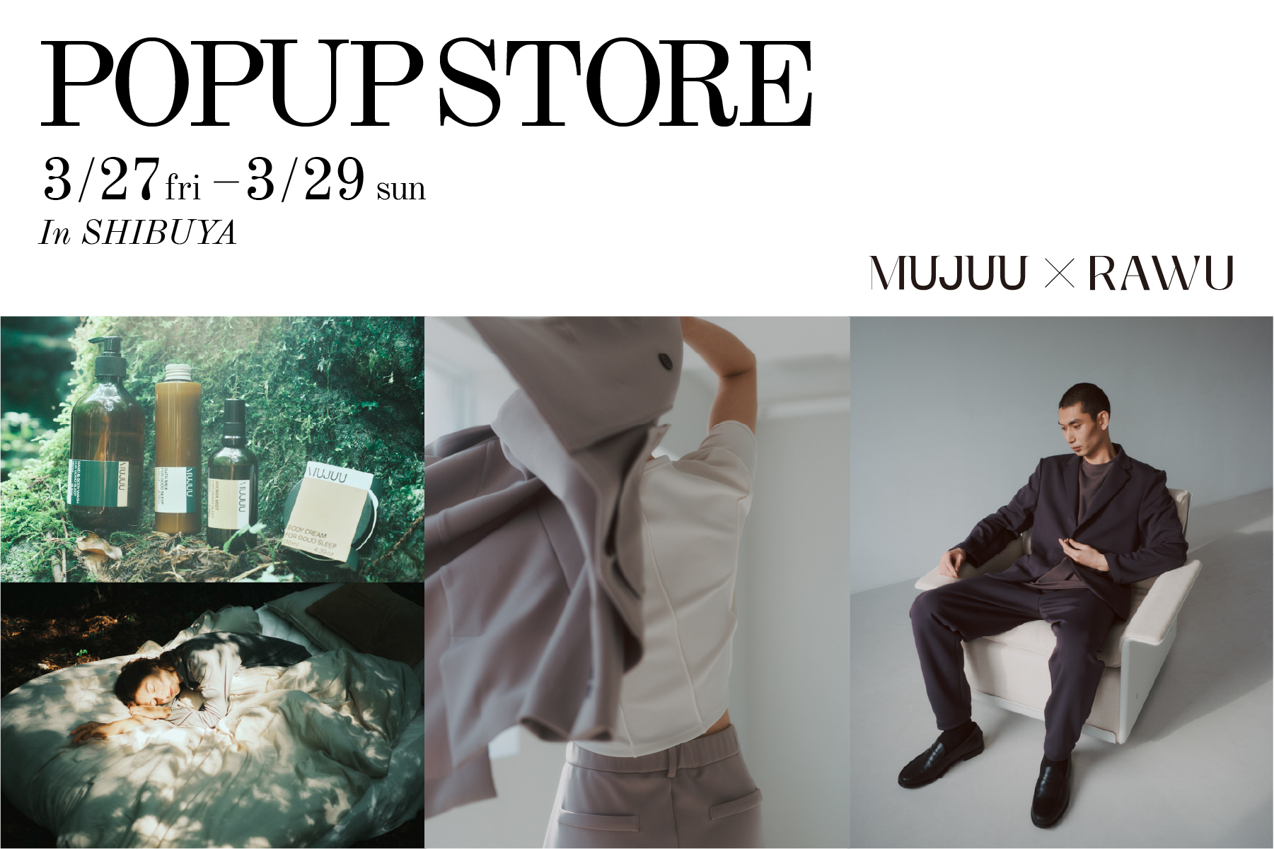 【3日間限定】睡眠アロマブランド「MUJUU」がアスレジャーブランド「RAWU」のローンチ展示会にて合同POP-UPを開催|3月27日より渋谷