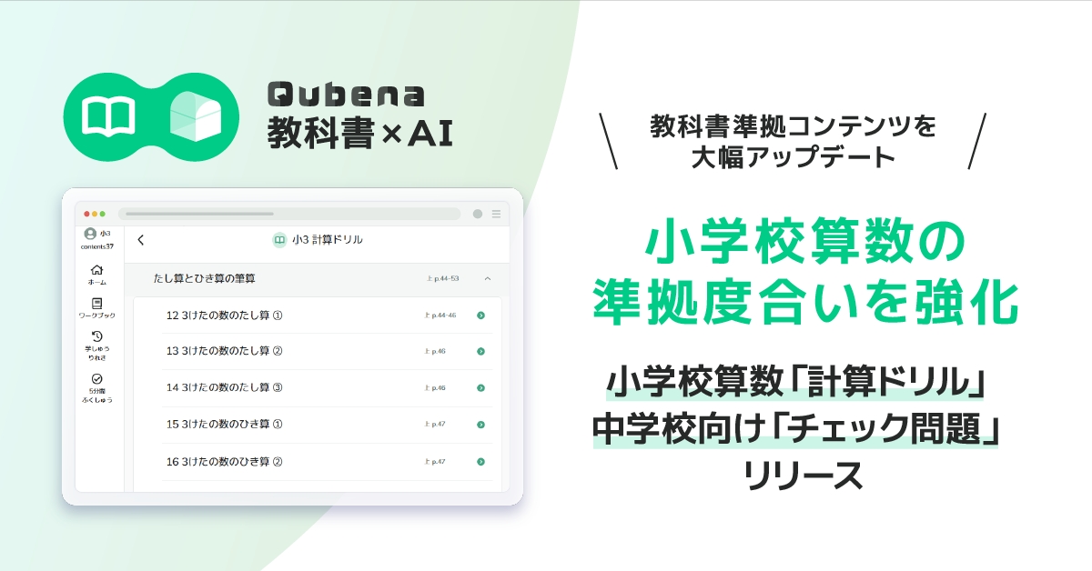学習eポータル+AI型教材「キュビナ」、教科書準拠のコンテンツを大幅アップデート。小学校算数の準拠度合いを強化、さらに小学校算数に「計算ドリル」、中学校向けに「チェック問題」を追加