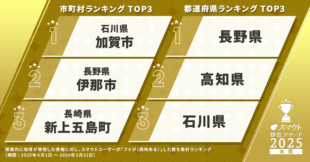 【人気移住先ランキング】約9万人のユーザーから興味を集めた「スマウト移住アワード2025」年間結果発表―加賀市が初の頂点に